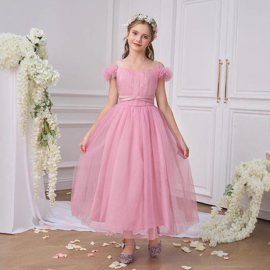 Pink Off-Shoulder Maxi Tulle Dress with Bows & Appliqué for Girls