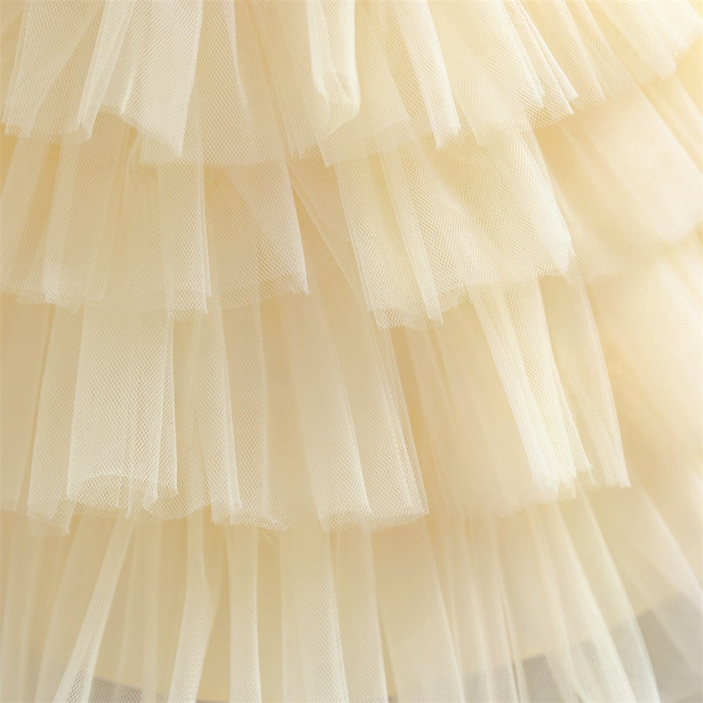 Make every celebration memorable with this adorable champagne tulle dress for girls. Designed in a flattering A-line silhouette, the dress features playful mini ruffle sleeves, a soft round neckline, and a charming tea-length skirt. Layers of delicate tulle, pleated detailing, and sweet fabric flower embellishments create a whimsical tiered effect. A hidden zipper ensures easy changes, while the gentle color adds an elegant touch perfect for parties, weddings, photo shoots, and formal events. Available for ages 6 months to 3 years, this dreamy dress brings fairy-tale style to any occasion.