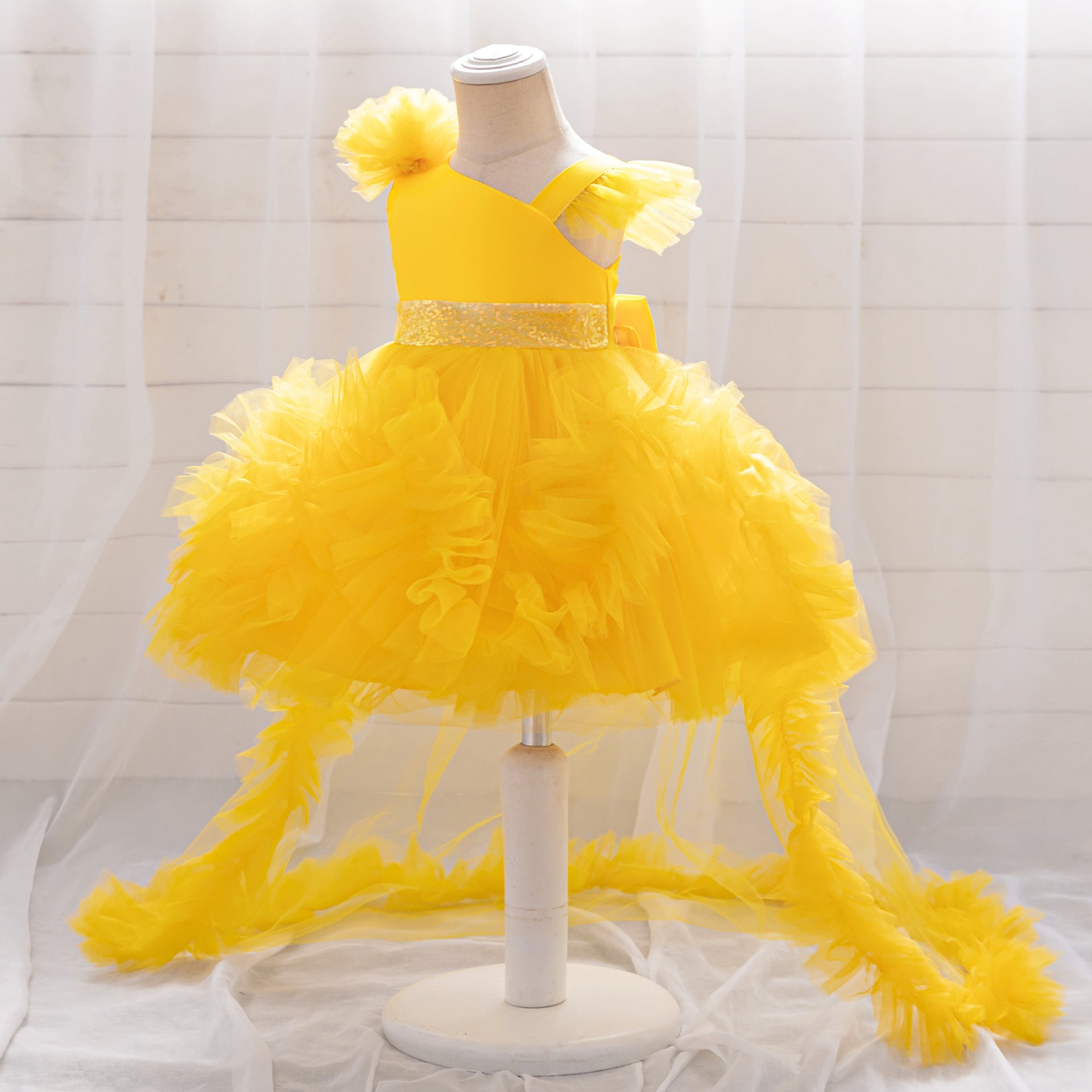Sparkle at every celebration with this adorable ball gown dress for girls, featuring a puffy tea-length silhouette and a charming off-shoulder neckline. Crafted from soft tulle with dazzling sequin and bead embellishments, this dress shines with every twirl. The pleated details and removable train add playful versatility—wear it long for a dramatic look, or detach for effortless movement. The secure zipper closure makes dressing quick and easy, perfect for parties, weddings, photo shoots, or themed festivals. Ideal for little girls aged 9 months to 4 years who love making magical memories.