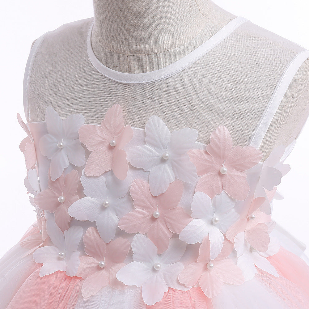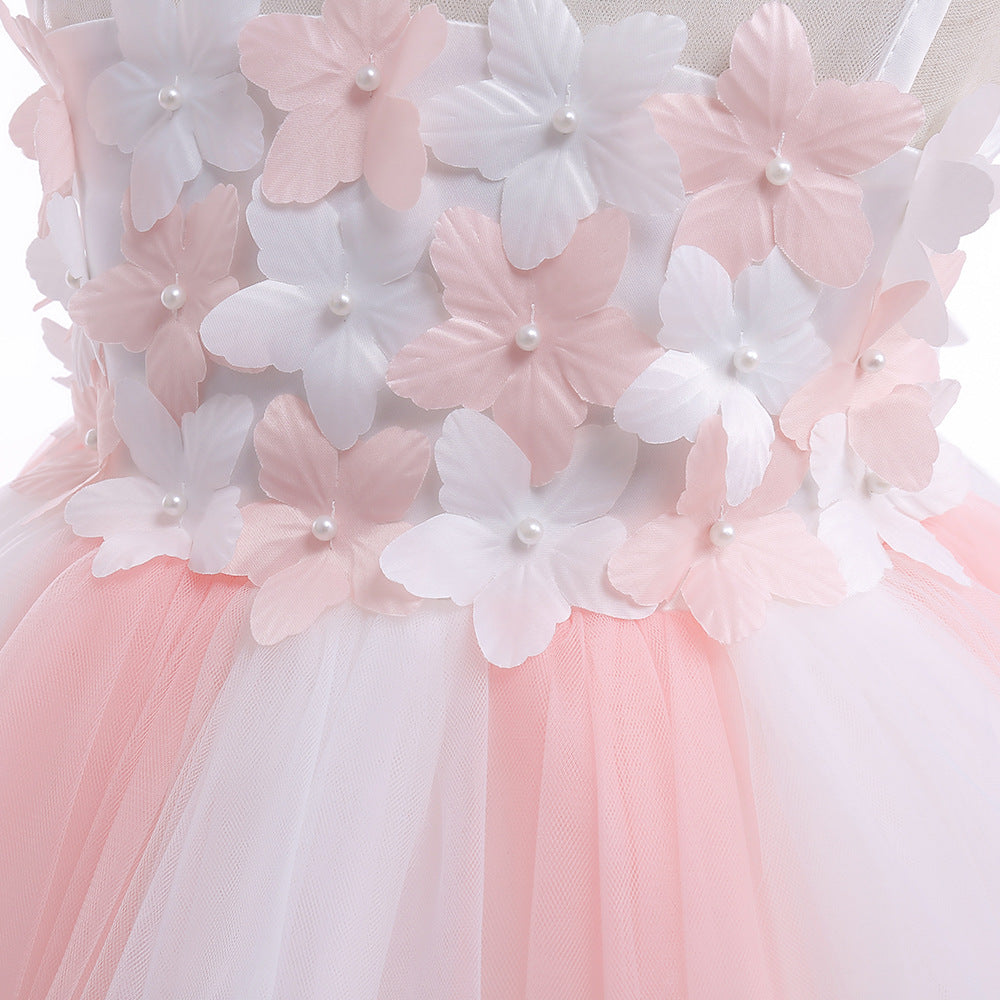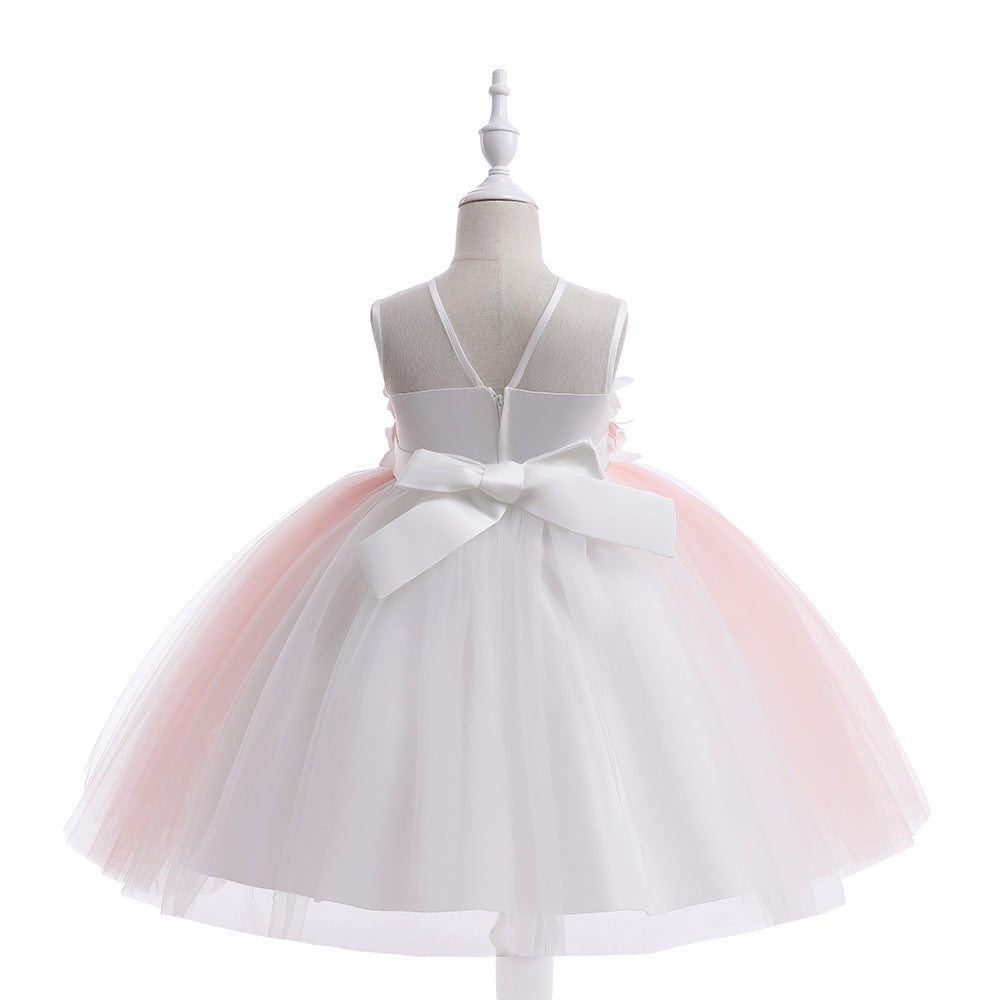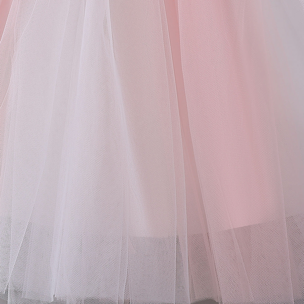This adorable light pink tulle dress features a sweet A-line silhouette with a playful off-shoulder neckline. Delicate fabric flowers and a charming bow accent make it perfect for girls aged 3 to 8. The tea length skirt adds a whimsical touch, while the zipper closure ensures easy dressing. Ideal for parties, weddings, flower girl duties, photo shoots, and special festivals, this dress brings elegance and fun to every occasion.