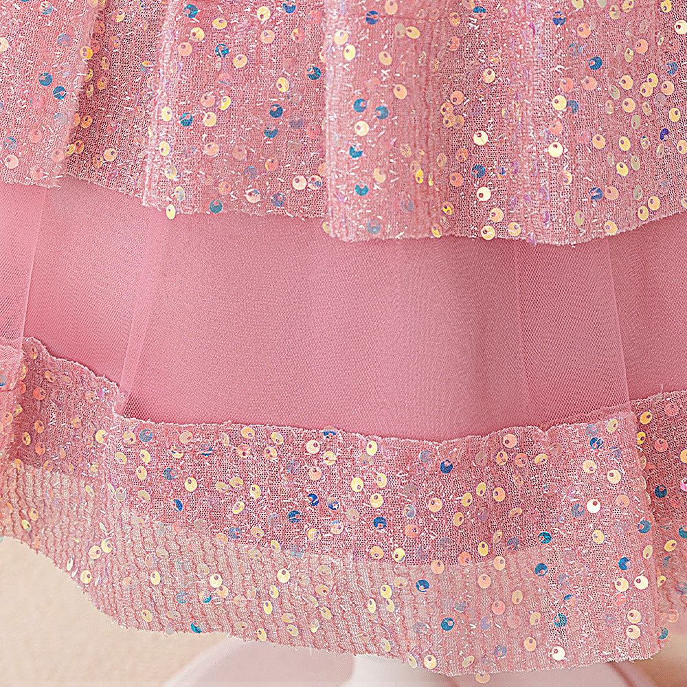 Let your little one shine at every special occasion in this adorable pink puffy ball gown! Designed with a playful off-shoulder neckline, the high-low hemline adds whimsical charm and allows for easy movement. The dress is crafted from sparkling sequin fabric and soft layers of tulle, featuring a stunning tiered skirt embellished with beads and glittering details. A smooth zipper closure at the back ensures a secure and comfortable fit. Perfect for parties, weddings, flower girl moments, photo shoots, or any festive themed event, this princess-inspired dress suits girls aged 3 to 10. Give her a magical twirl and unforgettable memories!
