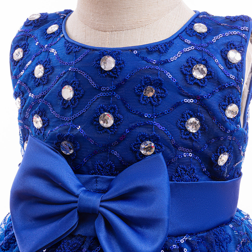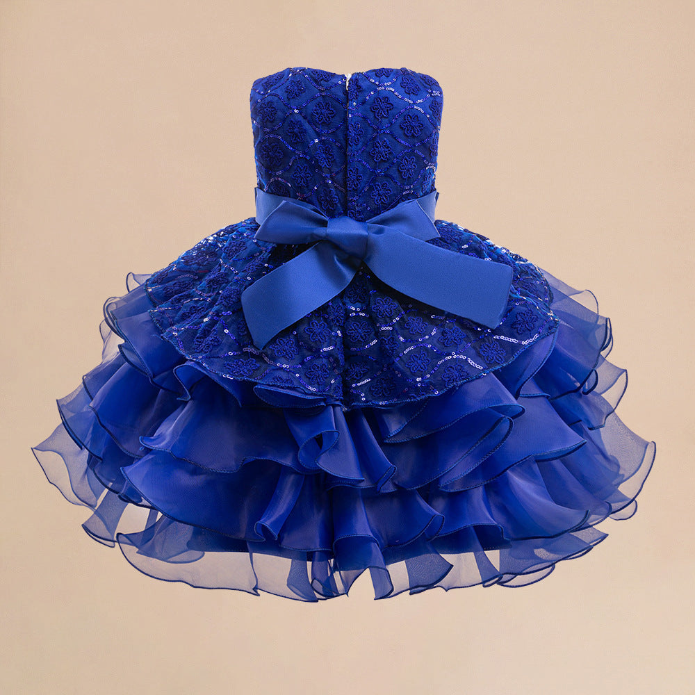 Add a touch of vibrant charm to special occasions with this adorable royal blue ball gown for girls. Crafted from soft lace and airy mesh, this tea-length dress features a playful puffy silhouette perfect for twirling and shining all day. The round neckline creates a sweet and youthful look, while dazzling sequins, sparkling beads, and delicate embroidery catch the light at every step. Charming bowknots and pretty tiered skirts elevate the princess vibe, making this dress ideal for parties, weddings, festivals, stage performances, or photo shoots. The easy-on zipper closure ensures a secure and comfortable fit for girls aged 3 to 8 years old. Let your little one shine like royalty at every celebration!