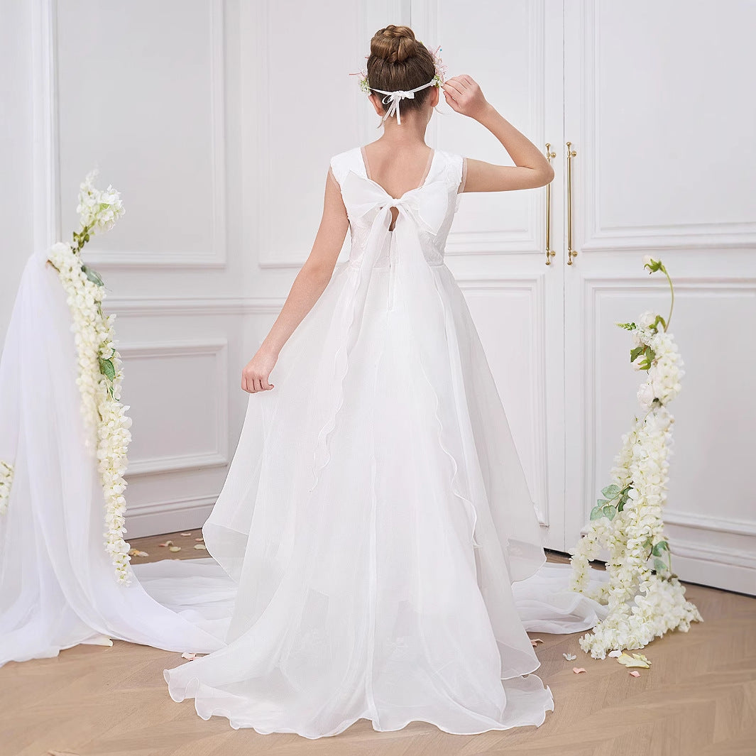 Make every special occasion truly magical with this adorable white lace high-low princess dress! Designed with a playful A-line silhouette and a classic round neckline, this charming dress features delicate lace embellishments atop airy tulle fabric. The high-low hem creates a whimsical effect that’s perfect for twirling, making it an ideal choice for parties, weddings as a flower girl, photo shoots, first communion, or any formal event. The soft fabric and secure zipper closure ensure comfort and easy dressing for girls aged 5 to 13. Let your little one shine with cuteness and elegance at every celebration!